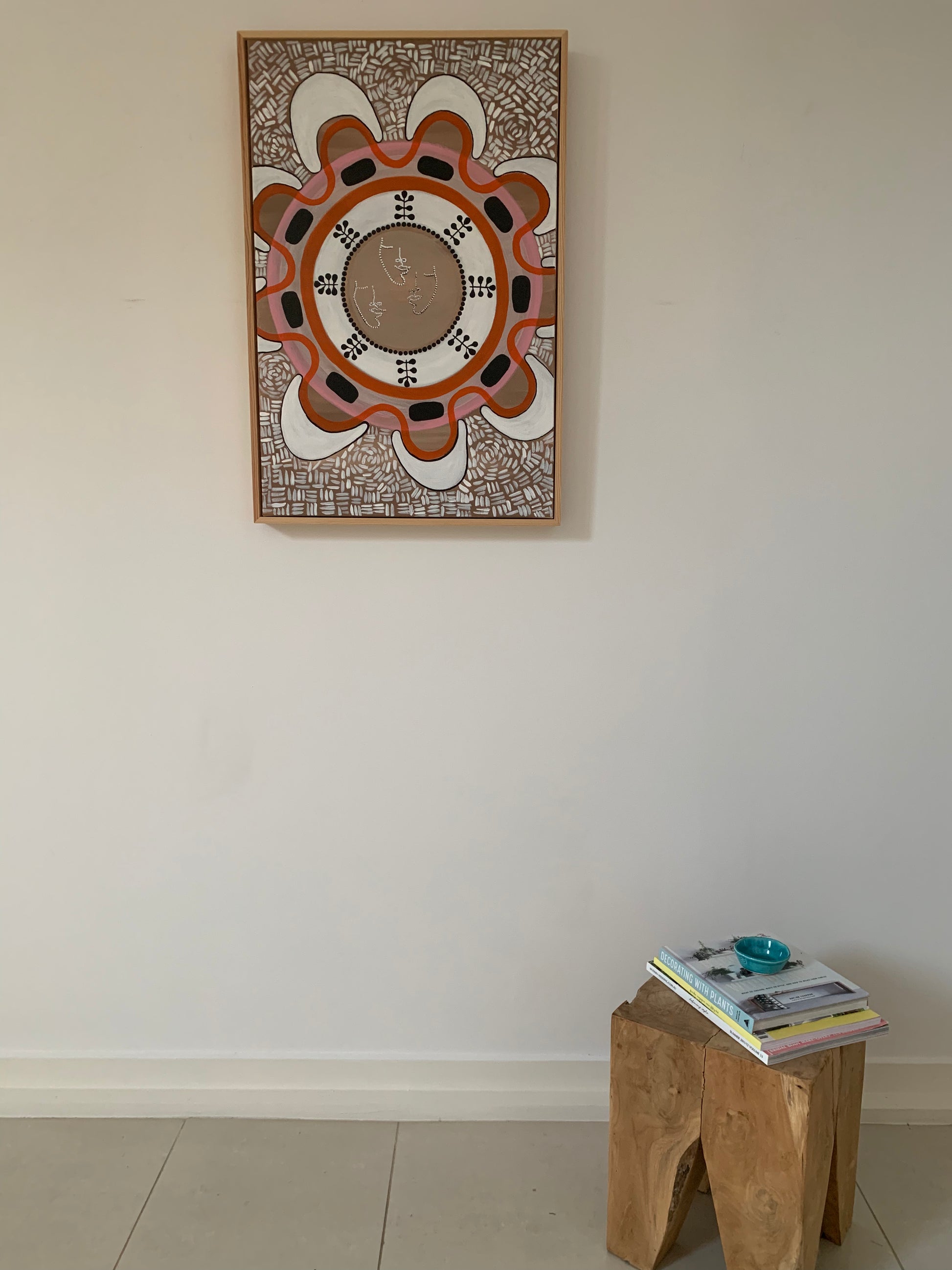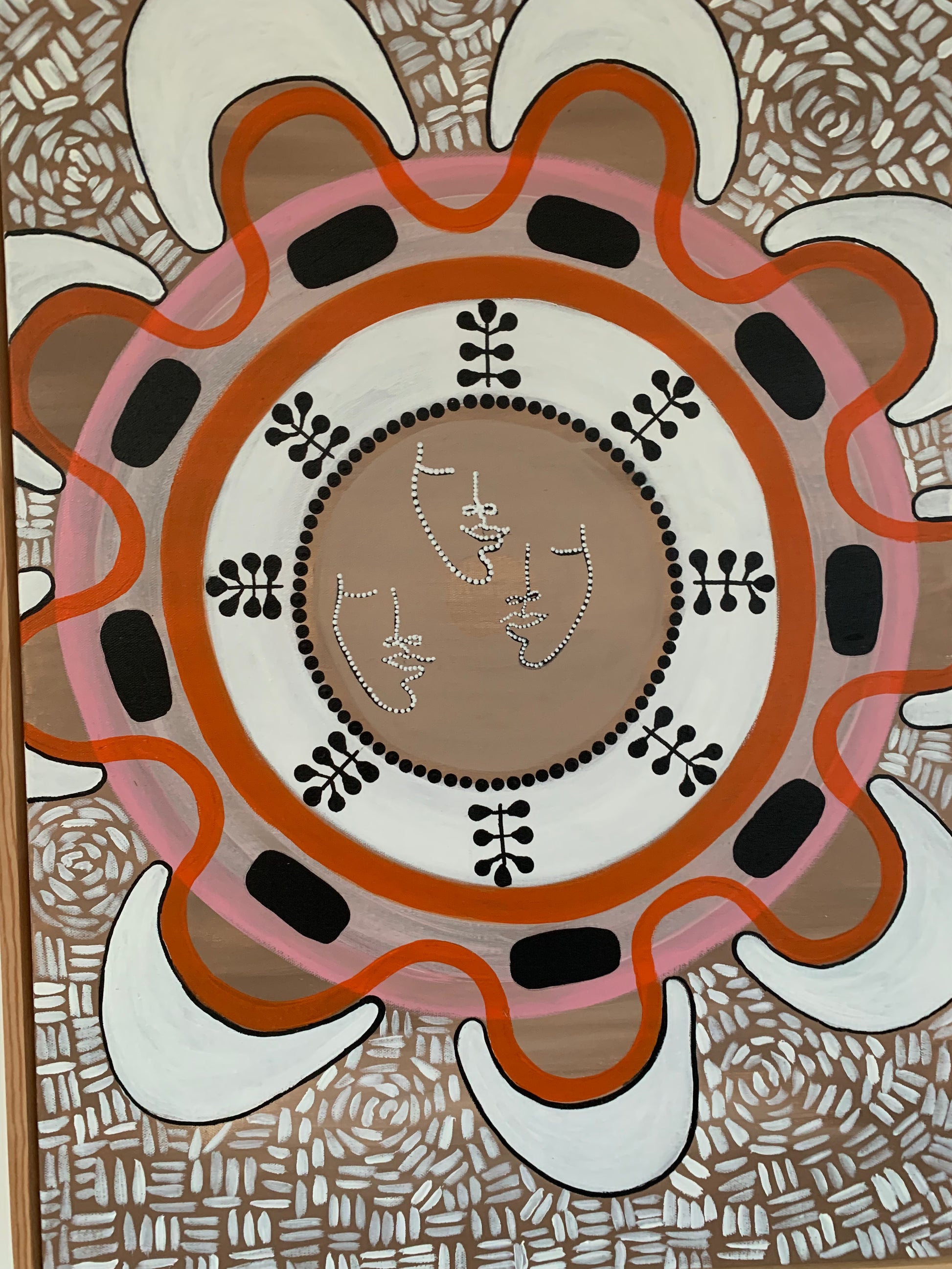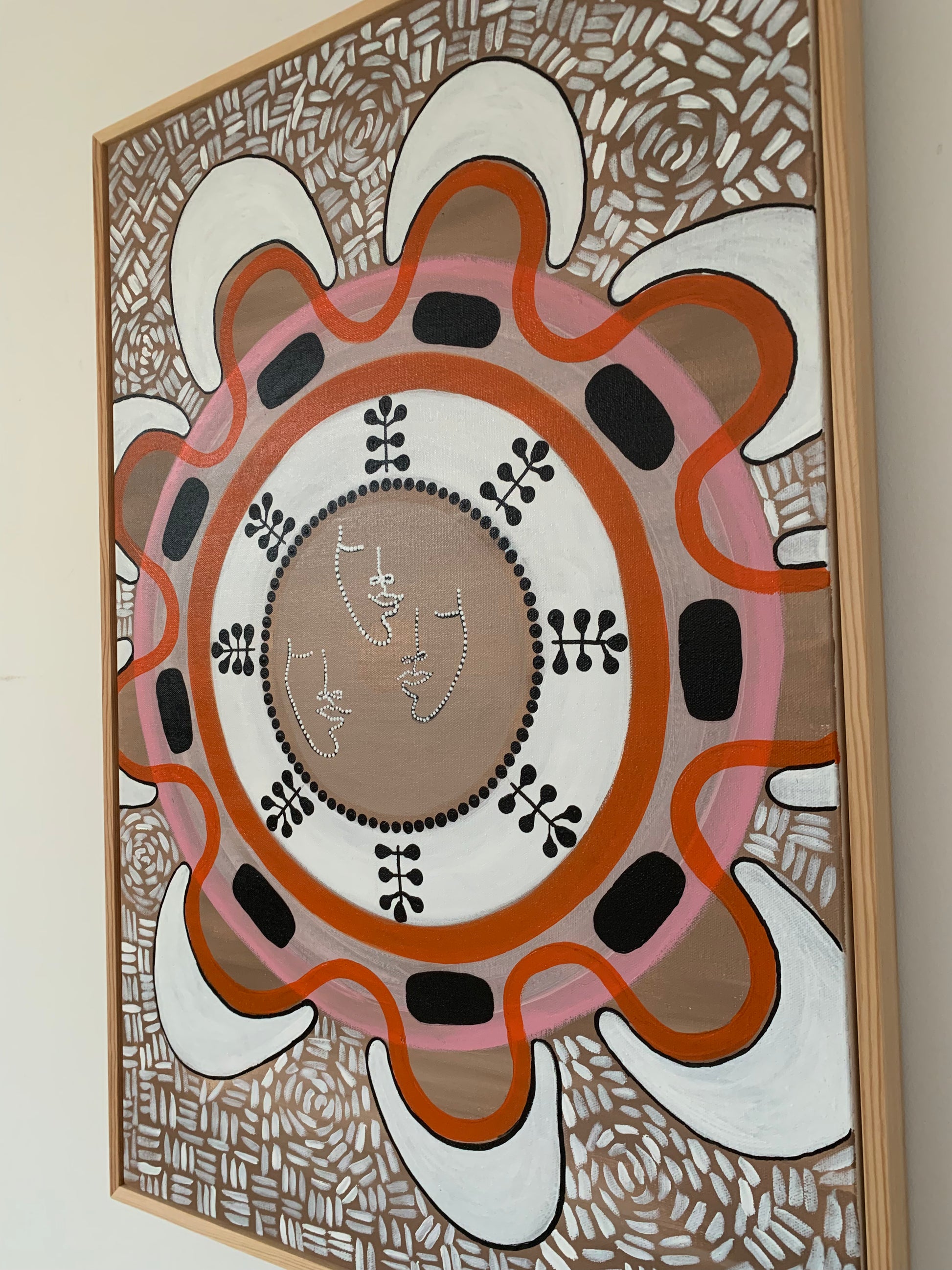 This original acrylic artwork represents close friendships. Friends are gathered together in a yarning circle offering love and support, its a celebration of friendship.