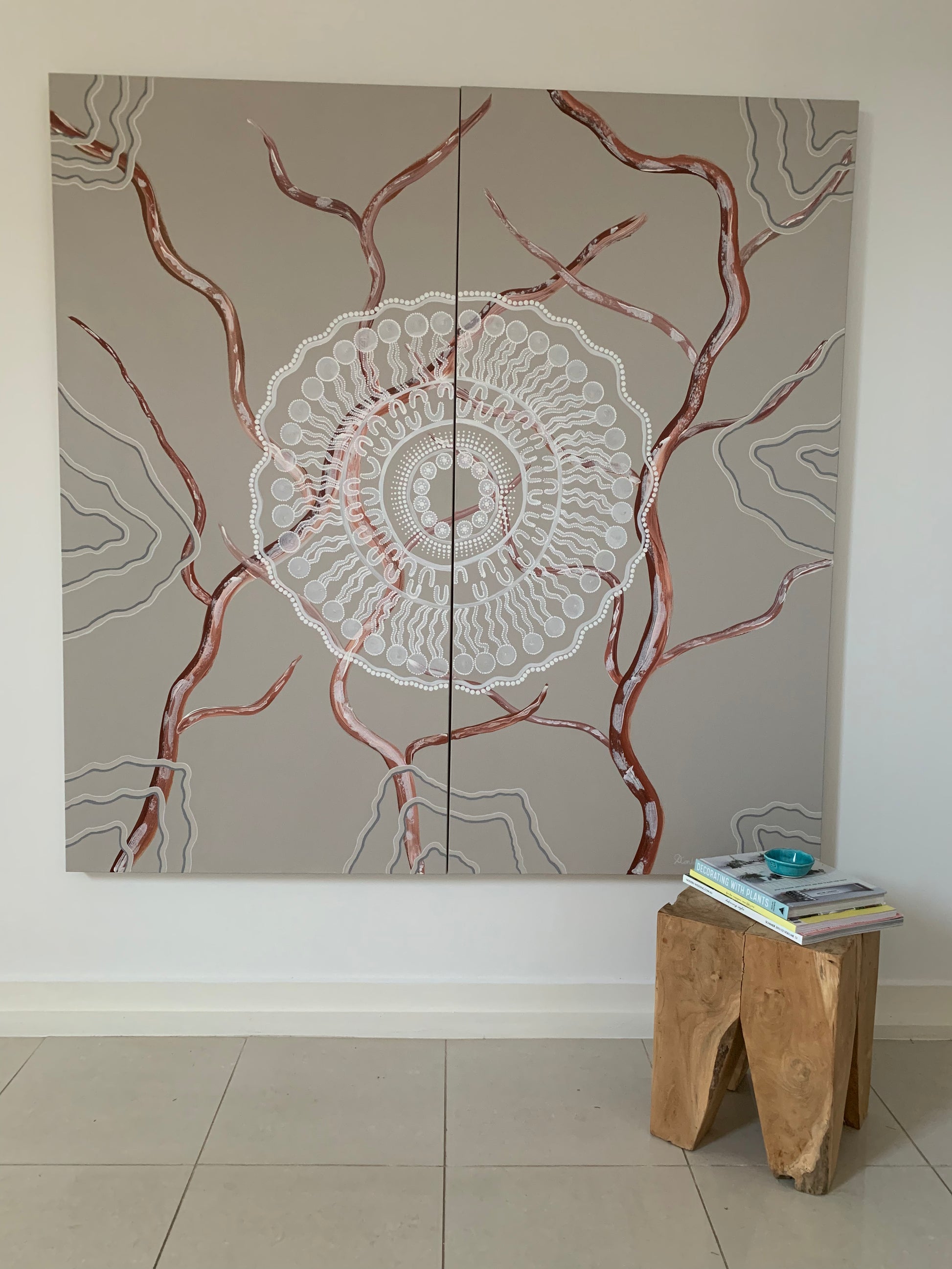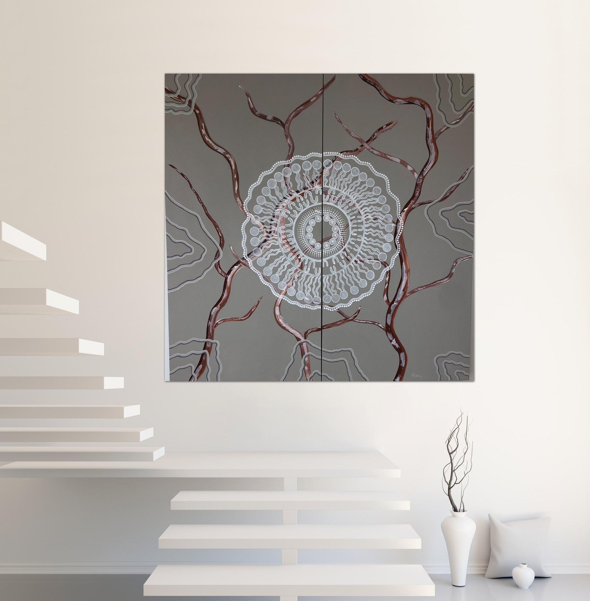 Its a large artwork, comprising of 2 individual panel canvases. Dancin with my spirits. It is a celebration artwork evoking feeling free